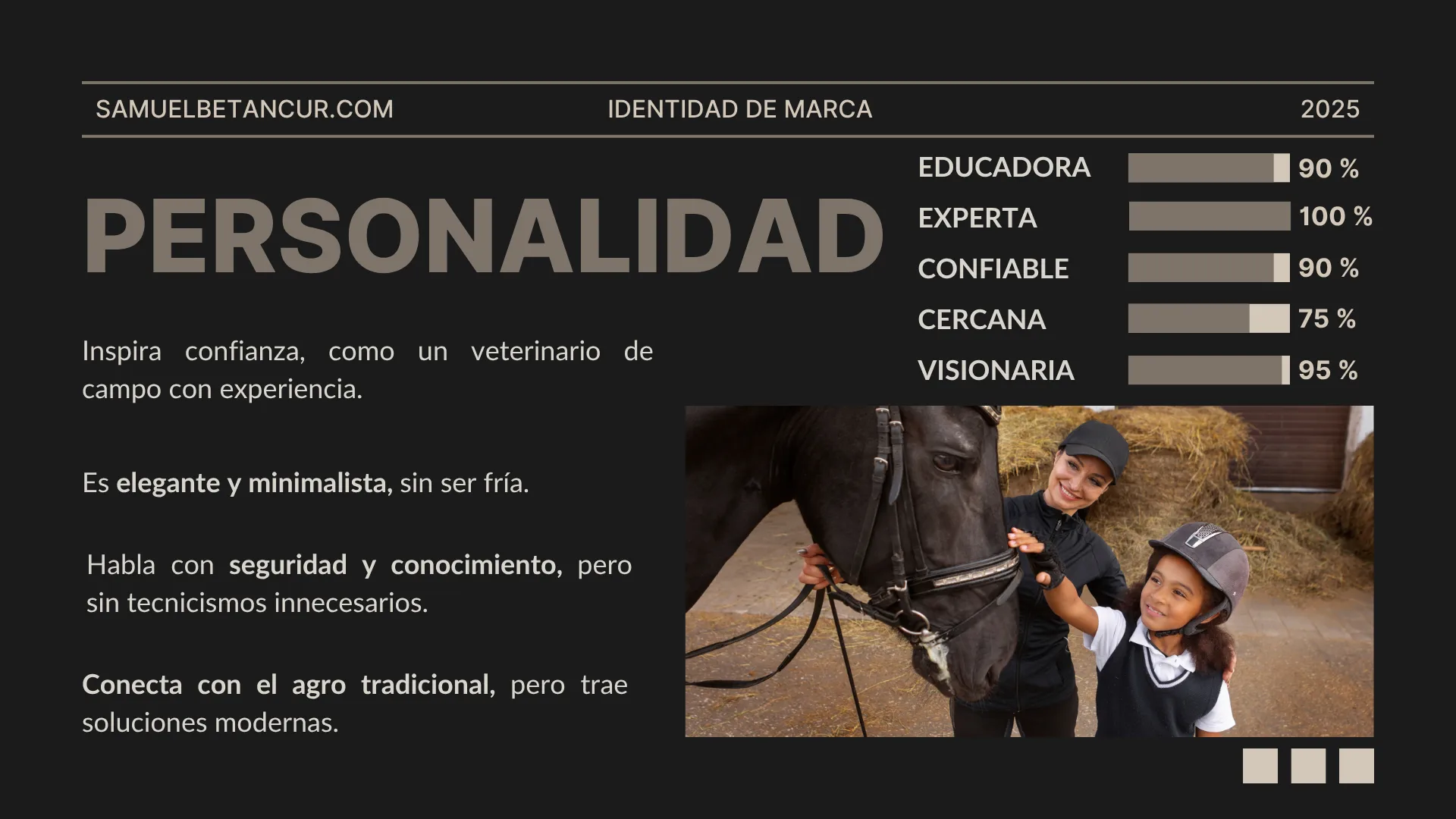 Desarrollamos un Manual de Marca exhaustivo para dotar al logotipo base de un ecosistema visual y conceptual sólido. Definimos una paleta de colores estratégicos basada en tonos cálidos y tierras contrastados con un negro profundo, logrando evocar calma, profesionalismo y una conexión directa con la tierra. En cuanto a la tipografía, implementamos Inter como fuente principal para aportar autoridad visual y limpieza moderna, complementada con Lato para asegurar cercanía y lectura amigable. Finalmente, estructuramos su tono de voz, personalidad y estilo fotográfico, transformando su logotipo inicial en una identidad corporativa que comunica ciencia, educación y diseño al más alto nivel.