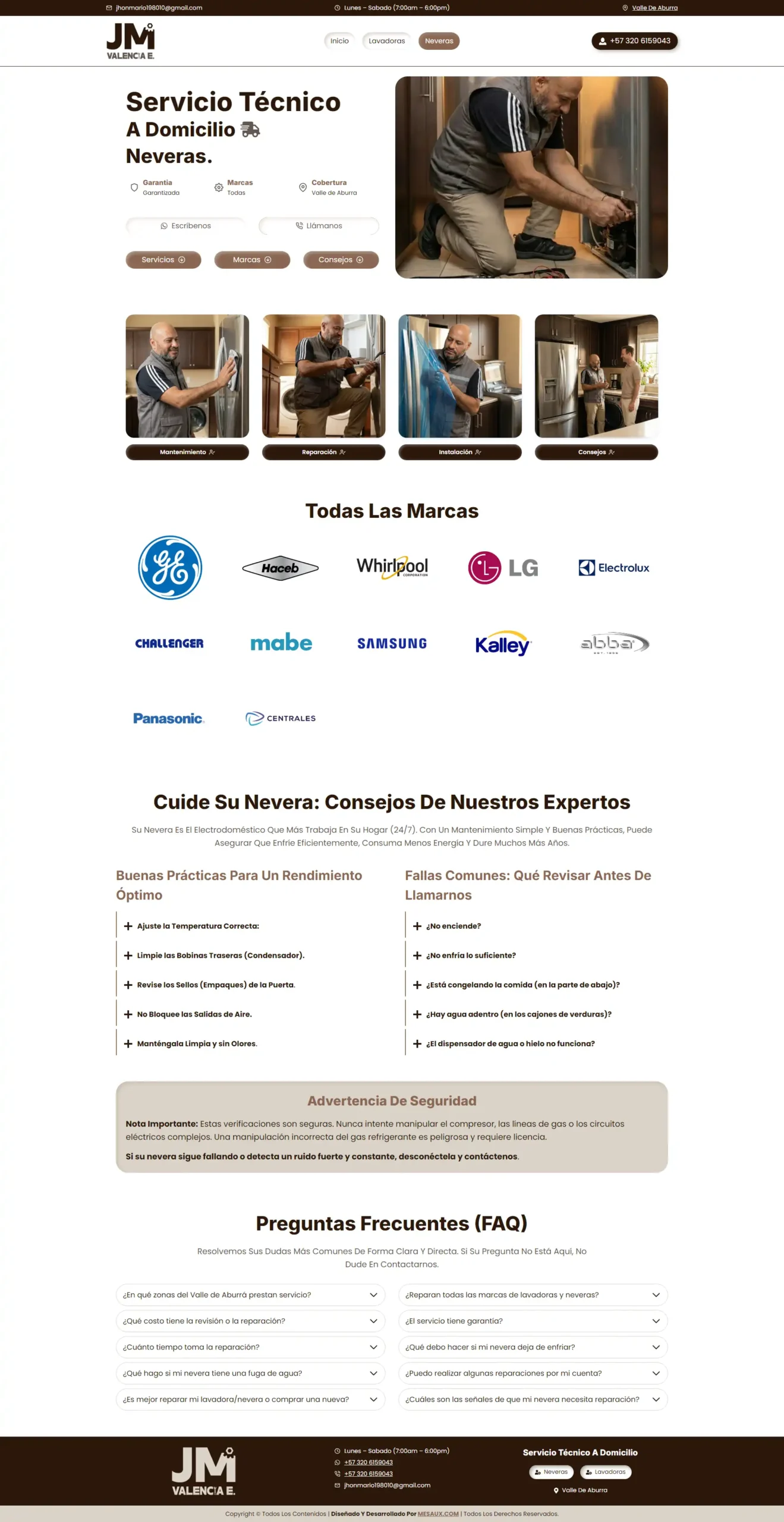 Diseñamos y desarrollamos una página web corporativa moderna, intuitiva y optimizada para dispositivos móviles, pensando estratégicamente en el usuario que necesita contactar a un técnico de urgencia desde su celular. Estructuramos el sitio web para destacar claramente su especialidad en neveras y lavadoras, integrando la nueva identidad de marca para transmitir profesionalismo y limpieza. Además, implementamos botones de contacto directo a WhatsApp transformando lo que antes era un negocio de tarjetas físicas en una máquina digital de captación de clientes y agendamiento de servicios 24/7.