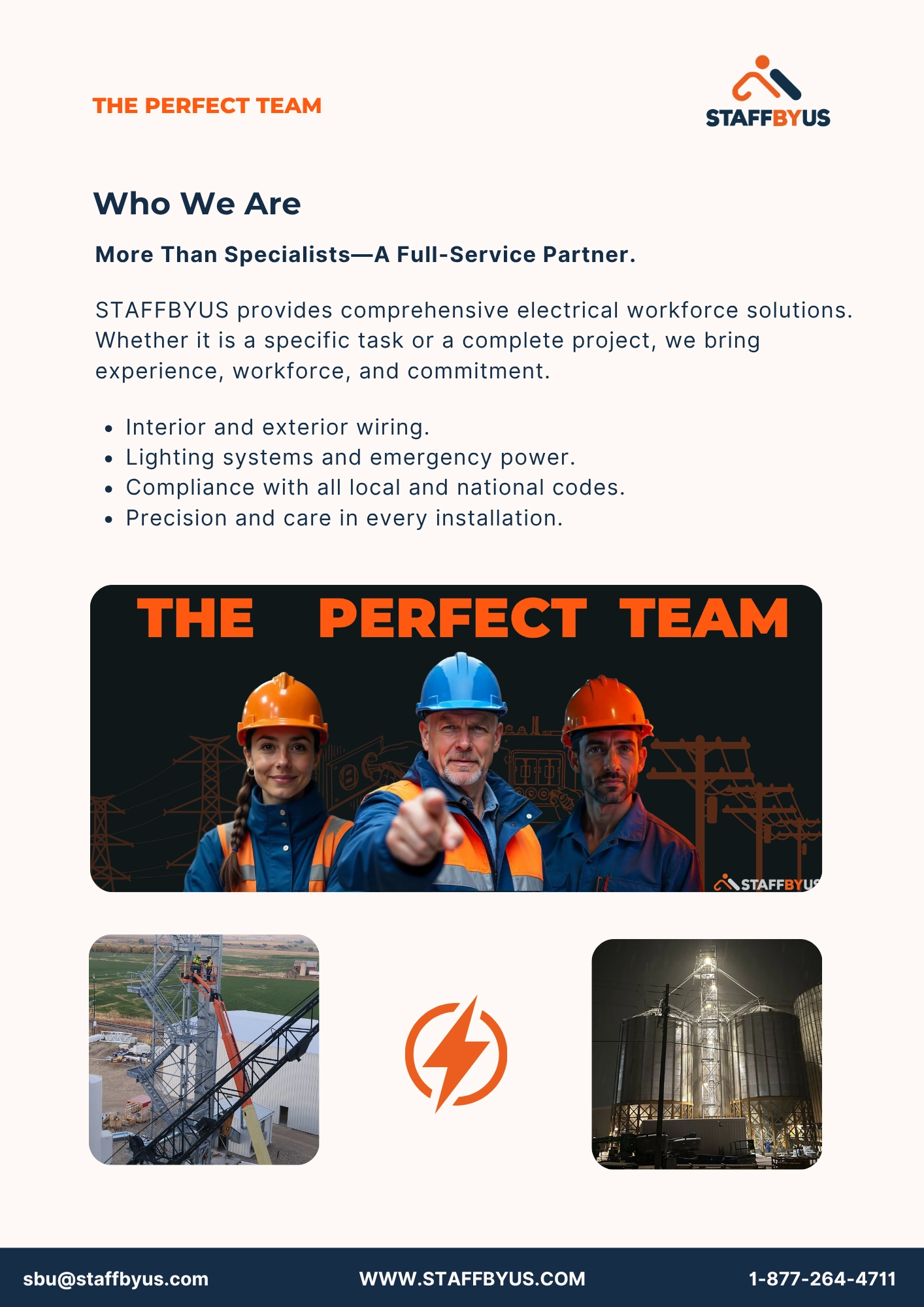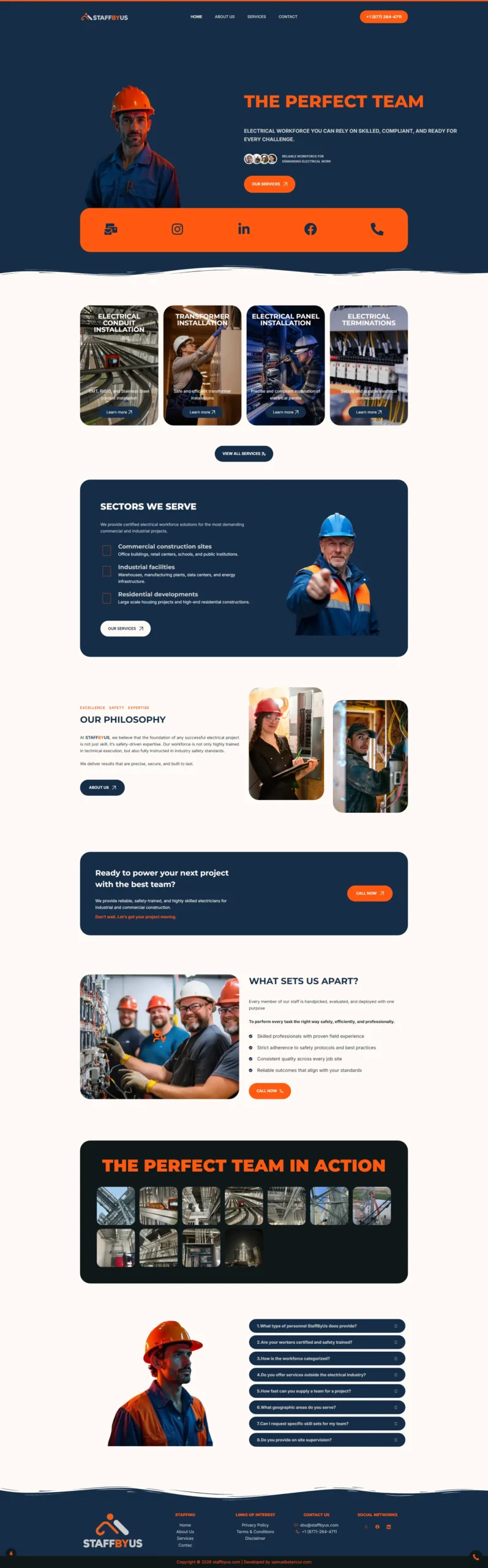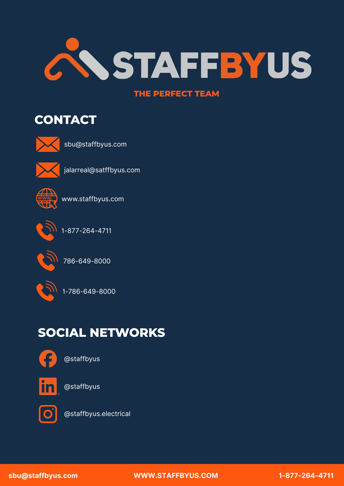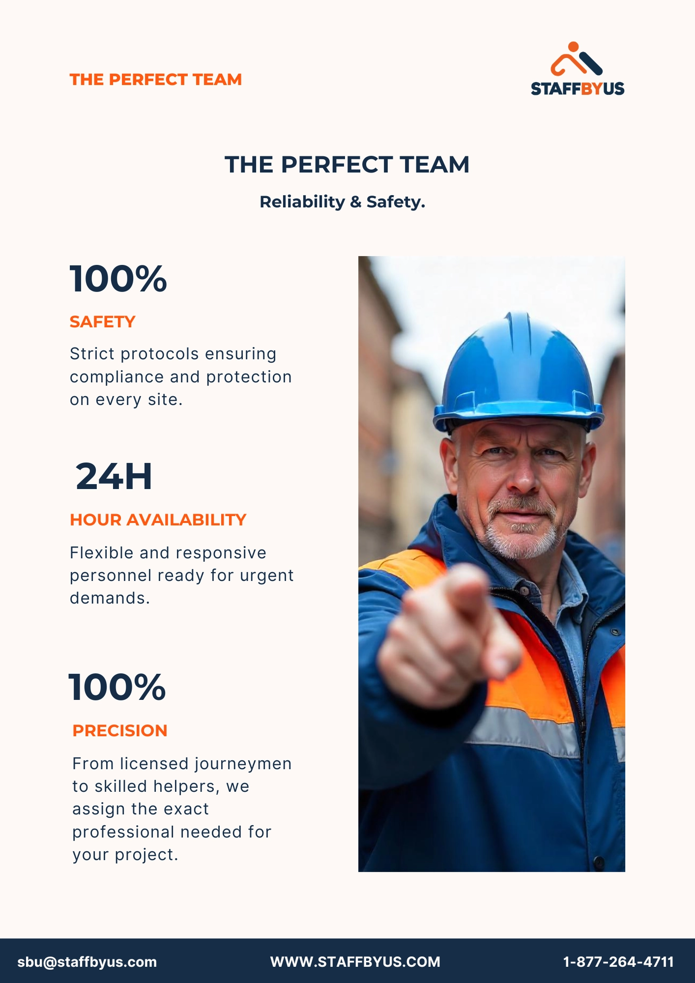 StaffByUs es una marca disruptiva en el sector industrial de los Estados Unidos, dedicada a conectar a contratistas con personal técnico y profesional de élite. Bajo la promesa de formar “The Perfect Team”, actúan como un puente estratégico que impulsa la ejecución de proyectos de manera eficiente y segura. Su enfoque garantiza estándares corporativos de primer nivel desde el día uno, respaldados por una identidad tecnológica, estructurada y valores inquebrantables de disciplina, innovación y confiabilidad.