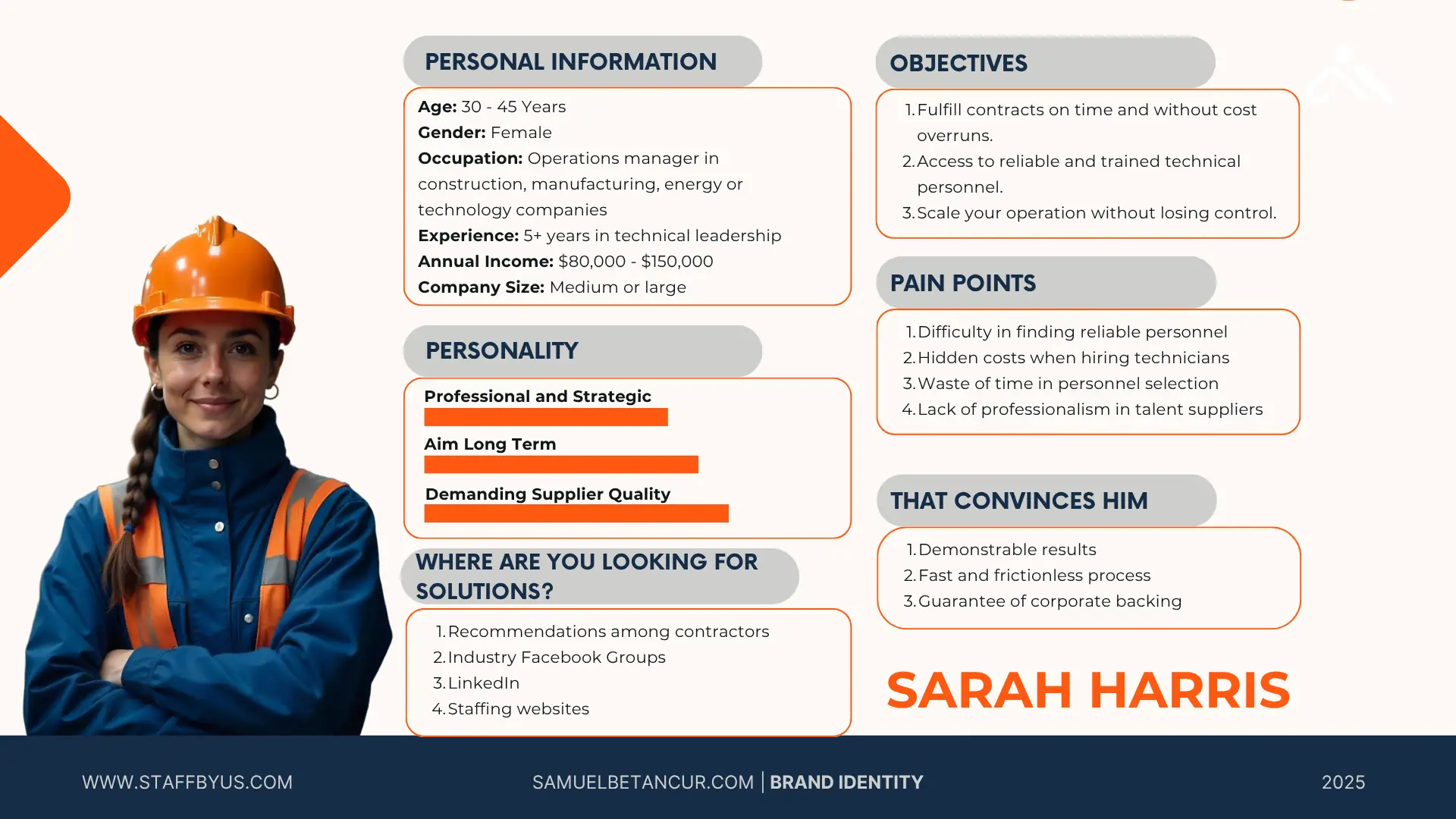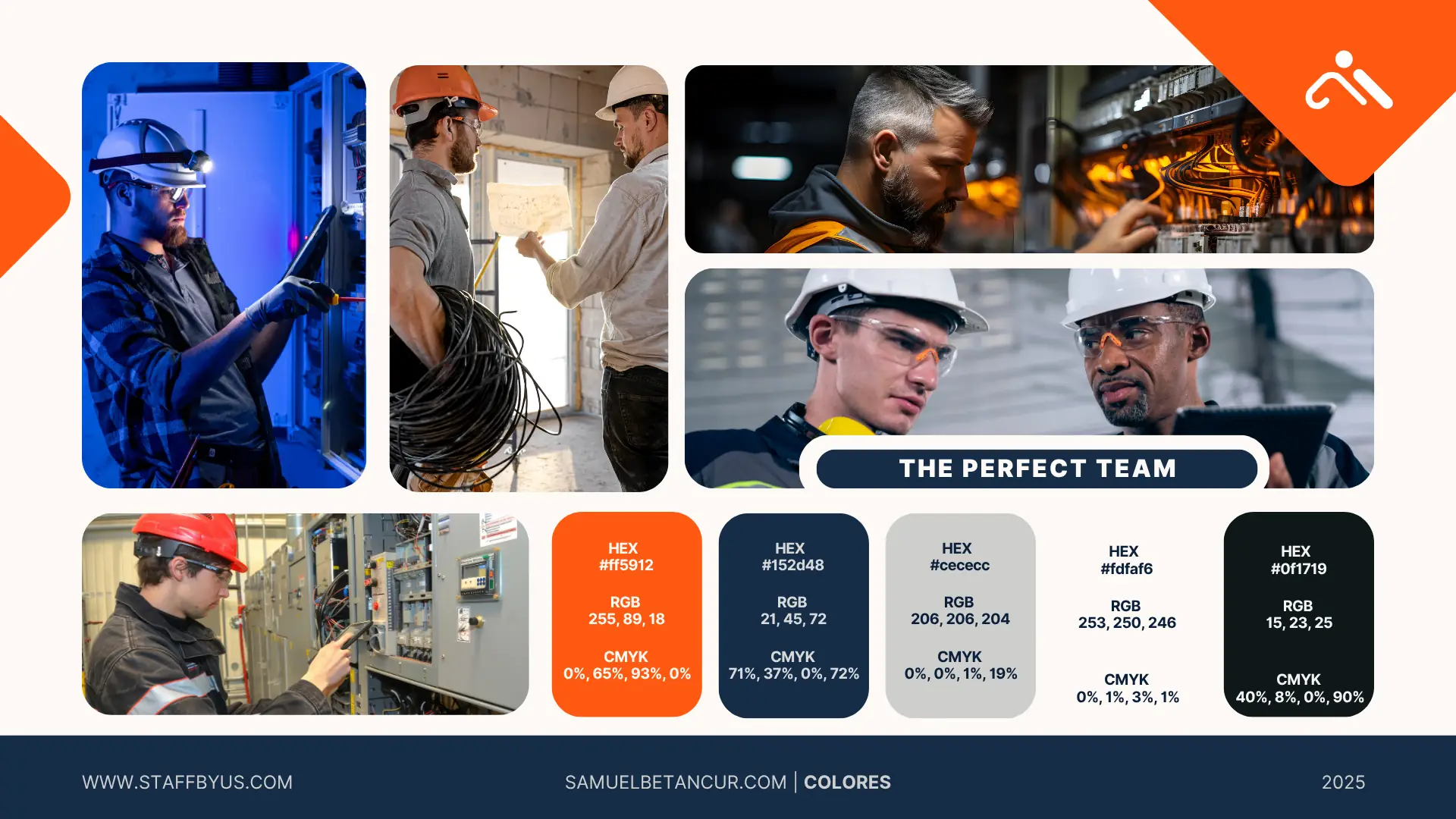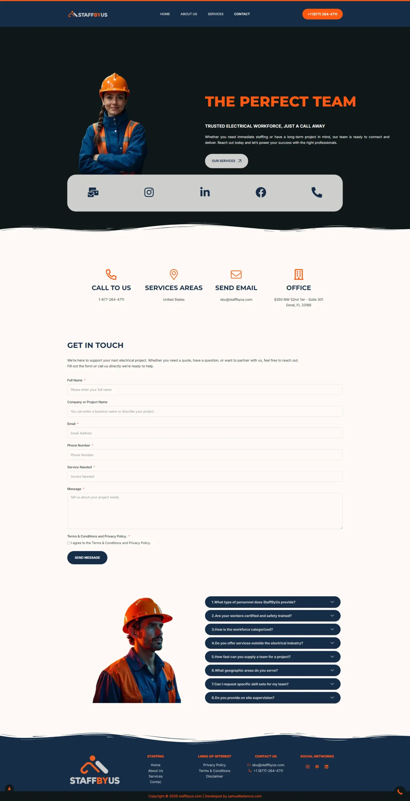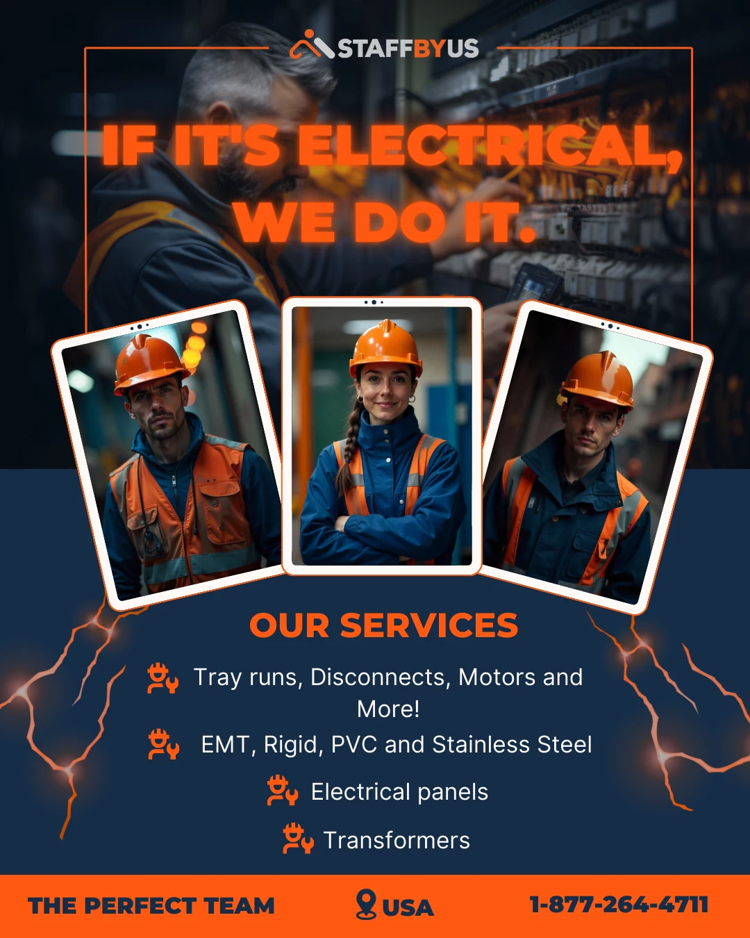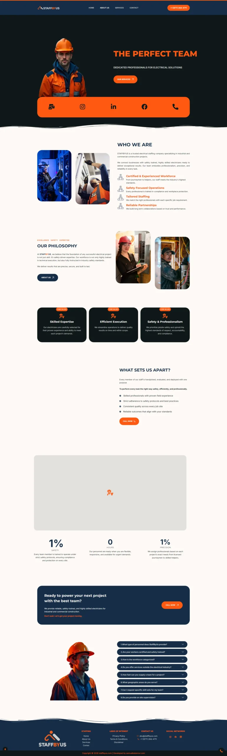 StaffByUs es una marca disruptiva en el sector industrial de los Estados Unidos, dedicada a conectar a contratistas con personal técnico y profesional de élite. Bajo la promesa de formar “The Perfect Team”, actúan como un puente estratégico que impulsa la ejecución de proyectos de manera eficiente y segura. Su enfoque garantiza estándares corporativos de primer nivel desde el día uno, respaldados por una identidad tecnológica, estructurada y valores inquebrantables de disciplina, innovación y confiabilidad.